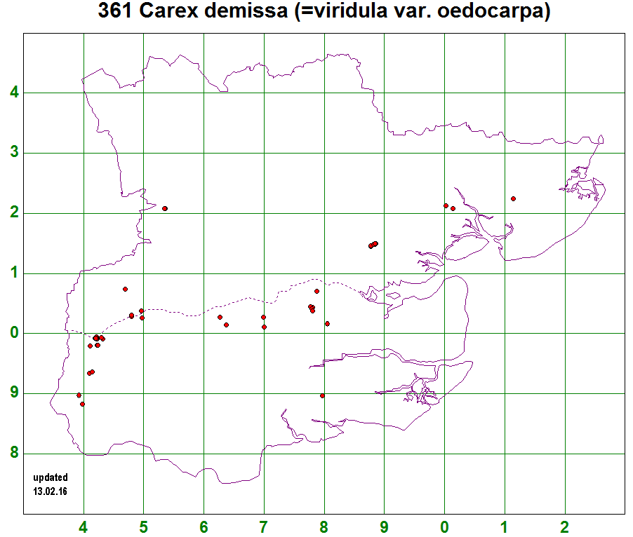 Great Bentley, south of Moore’s Lane, one plant in muddy pond margin. 24 June 1998. CNHS. |
