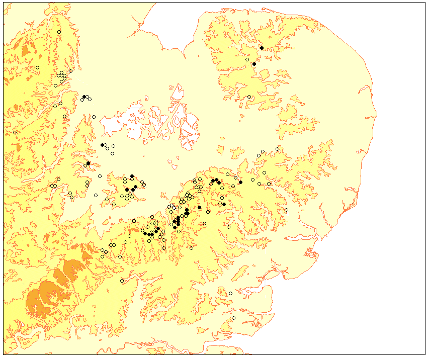 Fig. 3. Crested Cow-wheat Melampyum cristatum in Eastern England, showing height contours: less than 0m, 0-50m, 50-100m, 100-150m, 150-200m. In contrast, attempts to expand a natural population on behalf of the Heath Fritillary at Blean Woods RSPB reserve in Kent (Walter 2005) met in failure, most likely because the seedlings failed to establish haustoria. The majority of our Essex populations of Crested Cow-wheat are now on road verges. In this habitat, disturbance, such as pipe laying or trenching, exposing top soil, stimulates development – presumably due to lessening of competition, but it competes fairly well in quite tall vegetation. Following germination at the end of February/early March it can withstand light frosts, but needs to establish haustorial connections and complete its growth between April and May, and if flailed just once early in May, can sprout new flowering shoots providing the flail does not rip up the plants altogether. If flailed a second time in July the plants are killed. An early June drought can cause quite severe wilting. Flowering occurs from June to October with the first crop of seed around mid-July. By the first frosts of autumn the plants are already dead. Cross pollination is by bumble bees, and if this has not taken place by 4-7 days after becoming receptive the stamens bend round to effect self-pollination. No vegetative reproduction is possible, and being a summer annual or therophyte, if the plants are killed before seed set, regeneration the following year is dependent on the 15-40% of dormant seed that perenates over from the previous year. It is apparent from visiting a range of successful patches, that in virtually all cases the spots are sun traps protected from northerly winds. Just over the brow of a hill, or on the southern margin of a wood or hedge. Similarly on the continent where it ranges south to the Pyrenees, north east Italy and Albania, and east to the Urals. It is absent from the low countries and immediately south of the Baltic, but extends north to Denmark and southern Sweden. Everywhere it is a thermophile needing open sunny sites on south facing slopes experiencing temperatures between the limits of the 15.5o C July and the 10oC January mean monthly isotherms. It grows on a range of clayey, alluvial and sandy calcareous soils, but needs a certain amount of humus, not being found on skeletal/mineral soils over chalk and limestone, although it formerly grew on soils over limestone in Rutland. Of the surviving populations only a single native site is left in Northants, on a verge opposite Southey Wood, where according to Rob Wilson, it was flailed out of existence this year apart from a small patch where a tree obstructed the flail, and is unlikely to survive in the future. In Bedfordshire, again Chris Boon informs me that only a single site is left, on a road verge at Honeydon, where it varies in abundance from just a few to a 15x3m patch. In Hertfordshire it was deemed extinct, but this year Trevor James tells me that an old site near Nuthamstead produced plants, when the edge of an arable field abutting a wood was allowed to developed into a strip of grass. In Huntingdonshire a small patch survives along the south west margin of Monks Wood and at a second site on verges both sides of Stocking lane where Cambs.C.C. manage it sympathetically and a large population survives. In West Norfolk it now survives precariously at just one site on a verge at Beetley. West Suffolk and Cambridgeshire fair rather better with post-1990 populations surviving at around six sites and nine sites respectively. There do not seem to be any post-1990 survivals in either Leicestershire or Lincolnshire. Nearly everywhere the woodland populations have gone due to the lack of coppicing, field margin sites have been lost with conversion of grassland to arable, and road verges are now flailed in mid summer. In Essex we have populations surviving at around 12 known sites, some quite extensive, and we need to do a systematic re-survey of sites that have not been visited for some years. Management of verge sites is largely by way of Special Verge status by arrangement with local farmers, but ‘accidental’ flailing in the fatal July period by council flails is still a frequent occurrence, and in recent years flailing around the inside of arable fields before harvest is having a devastating effect on our arable field margin populations, and as elsewhere, patches are exterminated year on year. With in some cases crazy situations where wildlife strips are left and sown with ‘wild flower’ mixes for the birds rather than encouraging our local rarities. I propose to approach local farmers and wood owners in the area of its distribution in the hope of coming up with a coordinated strategy to protect and manage sympathetically the non-verge populations we have left, and to introduce seed back onto old sites where its survival can be enthusiastically guaranteed. Acknowledgements I am indebted to our BSBI Vice county recorders for supplying comments at short notice, to Alex Lockton for the BSBI database file of U.K. localities, to our dedicated team of verge reps who keep tabs on our Essex populations year on year, and to Peter Allen for the loan of the geology maps. References ADAMS, K.J. (1998) The Third Essex Flora and BSBI Atlas 2000 Projects: An historical perspective. EssexNaturalist 15: (New series) 57-59. ADAMS, K.J. (2007) Notes on Essex Specialities 12: the status and distribution of Sulphur clover, Trifolium ochroleucon Hudson in Essex and eastern England. Essex Naturalist (New series) 24: 115-118 FISCHER, E. (2004) The Families and Genera of Vascular Plants. Vol: 6 p.344. Springer. CROMPTON, G. (2008) Cambridgeshire Flora records since 1538. Part 1 & 2. Current web site: http://mnlg.com GIBSON, G.S. (1862) Gibson’s Flora of Essex. William Pamplin. London. GIBSON, W. (1993) Selective advantages to hemi-parasitic annuals, genus Melampyrum, of a seed