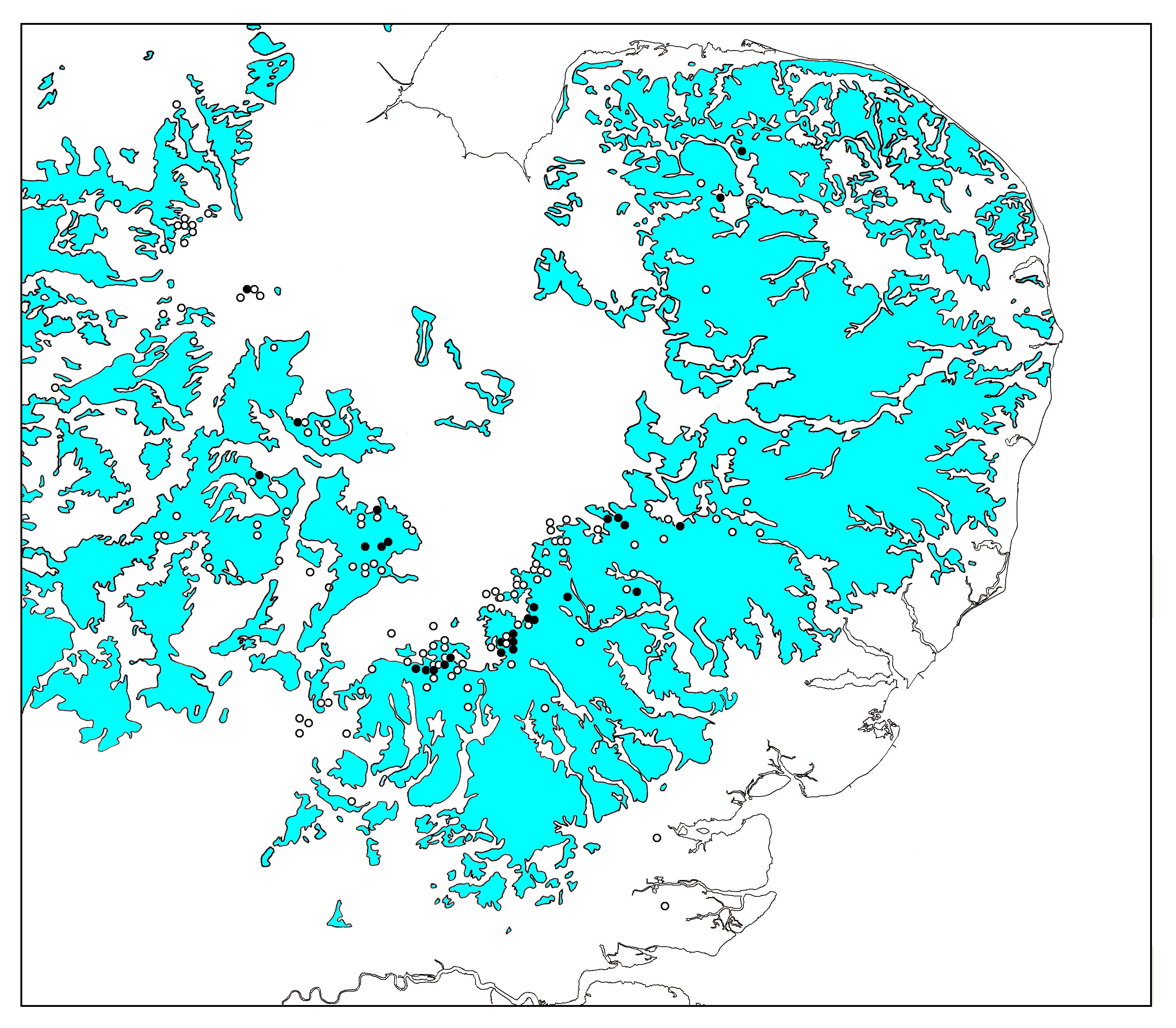 Fig. 2. Crested Cow-wheat Melampyum cristatum in Eastern England, showing Chalky Boulder Clay. Hand traced from: Quaternary Map of the U.K. South. Crown copyright reserved. Crested Cow-wheat grew in the past in woods (plural) near Gestingthorpe in 1724 (Samuel Dale), where it would have been on chalky boulder clay, and it was seen in Hazeleigh Wood, Maldon in 1886 on an EFC meeting. It does not grow in Hockley Woods! (Essex Birding 2008!). There was also a population way down in S. Essex in a meadow near Beckney Wood, found by R. Glover in 1972, growing with Orchis morio and Dactylorhiza fuchsii. Overgrazing and the use of the meadow for pony jumping destroyed it shortly after 1980 when Roger Payne found just a single plant. There seems to be no evidence of involvement of mycorrhizal fungi and it has been successfully introduced as seed to the Blacklands N.R. in Northants by Natural England. In Germany, experiments with M. pratense on acid soils in mixed woodland where Melampyrum was initially absent, using 300 seeds/m2 plot inoculations, resulted in successful establishment, and a mean rate of expansion of 0.9m per year with some patches expanding (with the help of ants) to 6.5m/year (Heinken 2004).