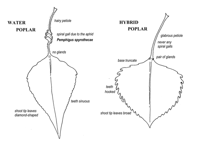 Common gall inducing aphids specific to Populus nigra sensu lato. Right to left: Pemphigus spyrothecae, P. bursarius, P. populi & P. populinigrae agg. P. bursarius, the Pouch Gall is another petiole specialist and is the next in frequency. It occurs commonly on ‘Italica’ and occasionally on betulifolia. P. populi, which forms a globular gall on the upper surface of the midrib with an access hole below and often splits open above, is less common. The next three all form similar linear pouch-like galls on the mid-rib, and you have to look at the aphids inside to identity which is which. Something I have not yet done although the pouches which start off green and then go red are not uncommon Characteristics of P. nigra versus P. x canadensis [ = euroamericana] Maiden P. nigra trees that have been allowed to grow for 60 years or more are now extremely rare, most trees are either low, middle or high pollards. In towns and parks ornamental P. nigra often gets treated like a Hybrid Lime or London Plane. If they are regularly mop-head pollarded most withstand it O.K. but if significant crown reduction or pollarding is carried out on a tree that has missed several cycles the exercise is frequently fatal. Many modern plantings are ridiculously over-crowded, in avenues or tightly packed groups. For these reasons it is virtually impossible to discern from the form of the tree whether you have a betulifolia/typica. Quite often one of the fastigiates has at some time been coppiced and it then becomes very difficult to separate them from betulifolia. I have listed some characteristics separating the commoner deltoides/nigra hybrids from nigra typica/betulfolia: 1. Populus x canadensis (Populus nigra typica x P. deltoides) ‘Italian’ Black Poplar Leaves with cartilaginous margins, thin, lamina not leathery, light green, rather large, teeth rounded, hooked and curving forwards towards the apex, base truncate to cordate and in some forms cuneate, two glands at junction of petiole and lamina, petiole and leaf veins glabrous. Terminal shoot leaves similar to the others. Buds and young shoots not smelling of balsam. Trunk and branches without burring or bosses. Branches ascending, not significantly downward arching. Bark deeply fissured with rounded spaghetti-like segments, usually grey in colour. Commonly supports Mistletoe. Never supports the aphids Pemphigus spyrothecae, P. bursarius, P. populi or P. populinigrae agg. 2. Populus nigra betulifolia/typica Water Poplar, ‘European’ Black Poplar, ‘Native’ Black Poplar. Leaves without cartilagenous margins, lamina rather thick and leathery, deep green, margin sinuous around most of circumference, may have slightly hooked teeth towards the base. Base of mature leaves cuneate to truncate but never cordate. No glands at junction of petiole and lamina initially but may be one later on, petiole and main veins below softly hairy in spring in betulifolia. Terminal shoot leaves markedly diamond shaped with cuneate base and long pointed apex. Further back, leaves may be truncate but not cordate. Buds and young shoots smelling of balsam. Trunk and branches usually, but not always, burred and bossed with epicormic shoots. Trunk black, fissured with slit-like fissures as if cut by a knife and pulled apart. Upper branches may however have grey spaghetti-like bark in large mature trees. Main branches arching over in wide arcs, often touching the ground. N.B. in recently pollarded trees these may be steeply ascending for the first 5-6 years. Rarely if ever supports Mistletoe [2 records]. The aphids Pemphigus spyrothecae, P. bursarius or P. populinigrae agg. all specific to P. nigra (including P. nigra typica, P. nigra ‘Italica’ (Lombardy), P. nigra betulifolia and P. x plantierensis). DIAGRAM TWO |