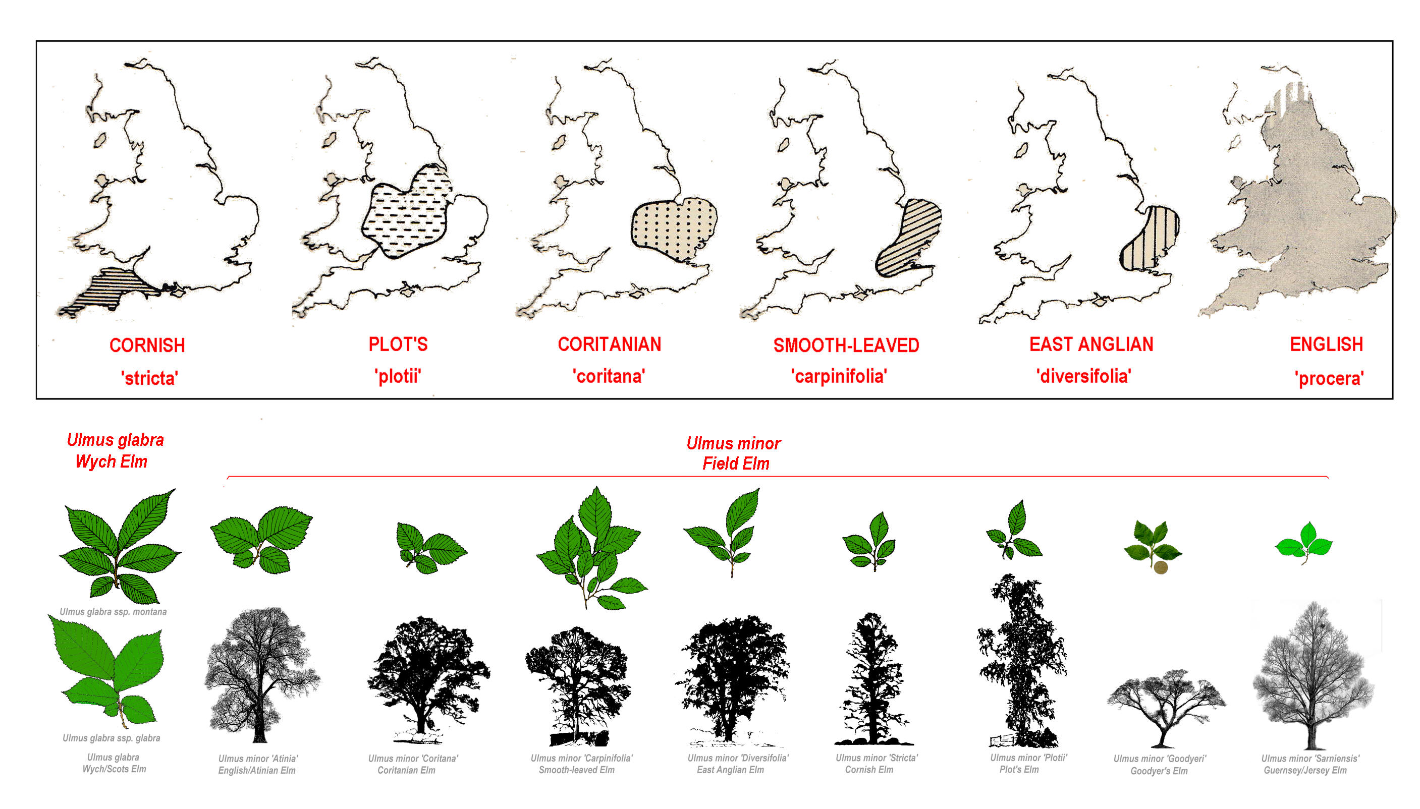 SYNOPSIS OF ELM TAXA FOUND IN SOUTH EAST ENGLAND As at October 2018 (KJA) The British Elm taxa comprise a bewildering array of vegetative clones and hybrids. They have been partially revised by Jayne Armstrong and Peter Sell in Volume One of Flora of Great Britain & Ireland. 2018 by giving binomial names to 62 leaf shape forms they have recognized, mainly in East Anglia. The best published treatment we have for the moment otherwise is that of Stace 1997. See also Essex Elm, Hanson 1990. The U.minor silhouettes and shoots are rearranged from The British Elms, R. Melville. The New Naturalist. 1948. [green button above] [Note that in Stace U. carpinifolia (Smooth-leaved) has been lumped with U. diversifolia (East Anglian) and U. coritana (Coritanian) ]. Dutch Elm disease has killed most of the mature elms in S and C Britain making them unidentifiable to Ssp. They persist as suckers in hedgerows, but as soon as they attempt to grow into a tree the disease strikes. Sucker/juvenile leaves are much larger and often of a different shape from mature leaves. Pure glabra elms do not sucker. As they spread by seed they are more variable as a result of crossing; minor and procera elms, however, sucker abundantly and largely spread vegetatively. See M. Coleman British Wildlife 13 p.390 for latest DNA data on clones adopted here and KJAs article on DNA & Elm origins (green button above). U. procera is now known to be a 1st Century Roman introduction. The minor and procera elms and their hybrids with glabra have minute red glandular hairs along the minor veins below [see figures green button above]. The procera elms have stiff white spiny as well as soft hairs making the upper surface scabrid. |