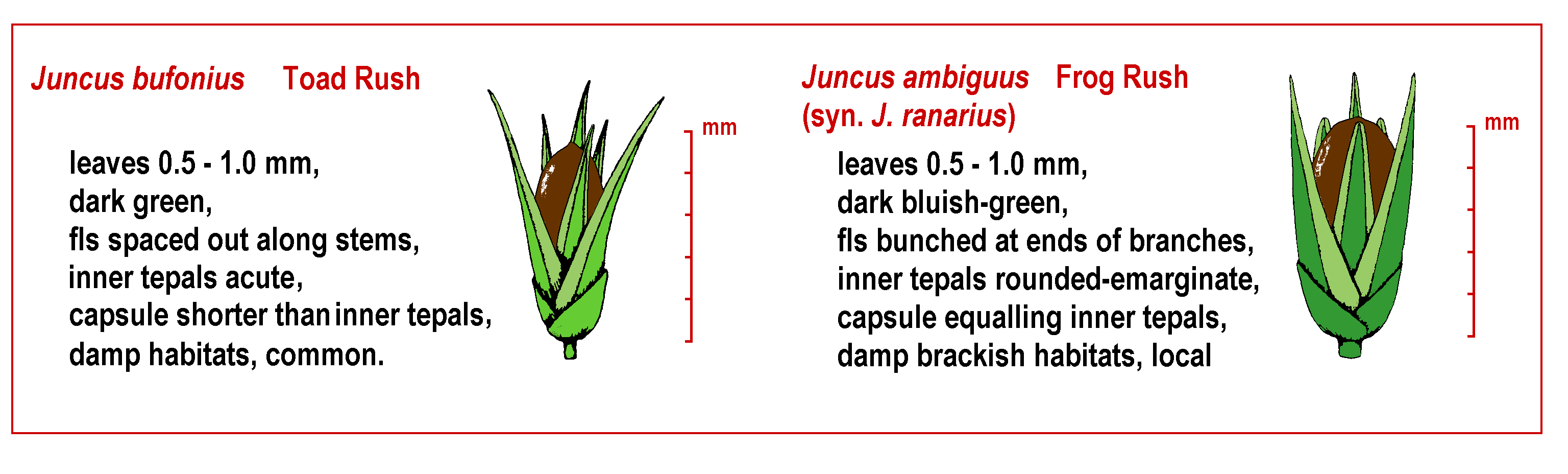 ___________________________________________________________________________________ Juncus ambiguus Guss Frog Rush ___________________________________________________________________________________ This quite distinctive annual rush was recognized as a separate taxon from J. bufonius as long ago as 1905 (Songeon & Perrer as J. ranarius) but it was not until the illustrated paper by Cope and Stace Watsonia 12. 113-128. 1978 that it began to be systematically recorded in this country. By 2007 it had been recorded in around 120, mainly coastal, hectads. It is obviously more widespread in Essex than formerly thought, and may well have been overlooked. On the other hand it may be freshly colonizing the county, - the colony at Fobbing being a definite new arrival. Its more squat, bluish-green flower heads that tend to cluster at the ends of the shoots, once known, are quite distinct from J. bufonius. The tendency for the inner tepals to be blunt-rounded at the apex, and no longer than the capsule, is diagnostic. At Jaywick, it seems to like damp-wet saline habitats at the back of the sea wall, and is particularly abundant in public car parks which suggests that the seeds may be spread by car tyres. So far it has turned up at Foulness, Fobbing Jaywick and Aveley Marshes, but now we have our eye in for it, it will probably be found to be far more widespread. At Aveley it occurs over a wide area of low saline marsh some distance from the sea. |